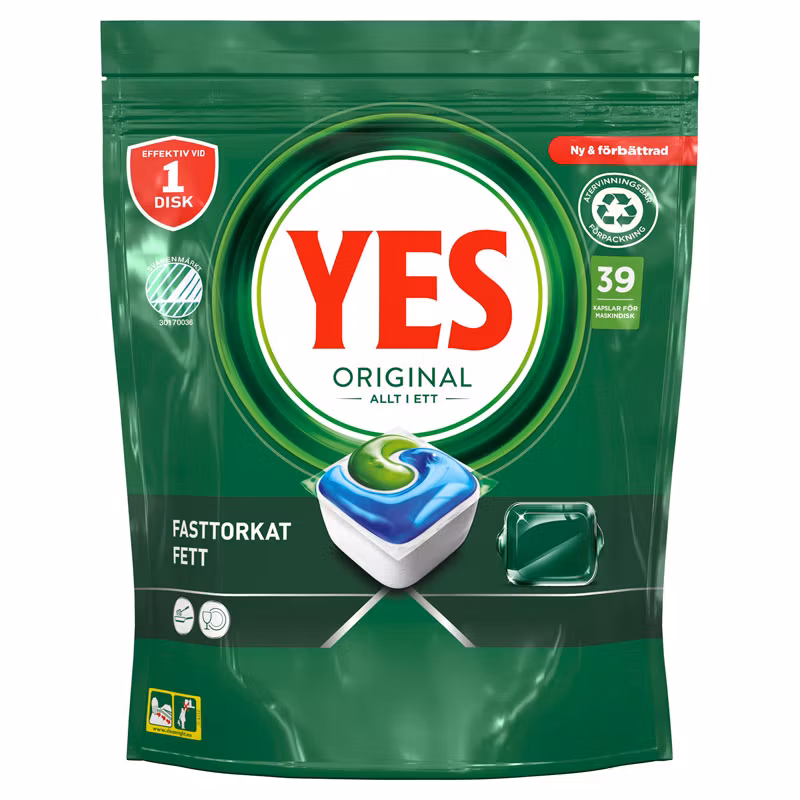 Allt-i-ett-tabletter för maskindisk. Kraftfull rengöring med inbyggd spolglans.